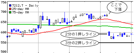 この企業の株価は業績下方修正の発表をうけて大幅に下落しました。この銘柄の年初来最安値は470円、年初来高値は710円です。 押し目の水準は、高値の710円と安値470円の上げ幅の2分の1下げた価格である、590円(これを2分の1押しと言います)、又は3分の2下げた価格である550円(3分の2押し)となります。 どちらを待って買うかはリスクの取り方などによりますが、ここまで下がれば、株価の習性から考えていったんリバウンドに入る可能性が高くなるので、短期リバウンド狙いの買いタイミングとなります。 ただし、こうした短期リバウンド狙いの押し目買いでは、リバウンド後はいったん利食いが基本ですね。 この他にも75日線まで下がれば買うというやり方もあるようです。 プロのナンピン買いの考え方もまた同様の手法を取るそうです。 [参考文献] |